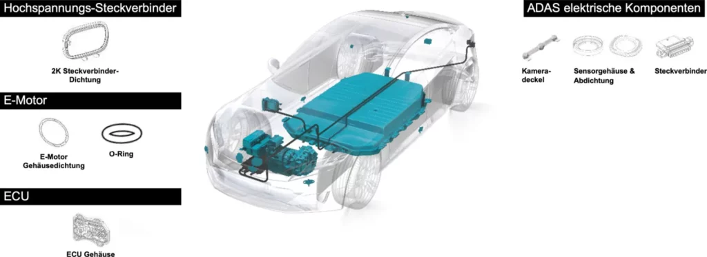 Wir haben eine breite Palette von Produktlösungen und Technologien. Diese umfassen nicht nur Elastomer-, Metallträger- und Zwei-Komponenten-Dichtungen aus Thermoplast und LSR (Flüssigsilikonkautschuk), sondern auch O-Ringe und Dichtungen für Steckverbinder. Allesamt decken sie die systemkritischen Anwendungen unserer Kunden im Hinblick auf E-Antriebe umfassend ab.