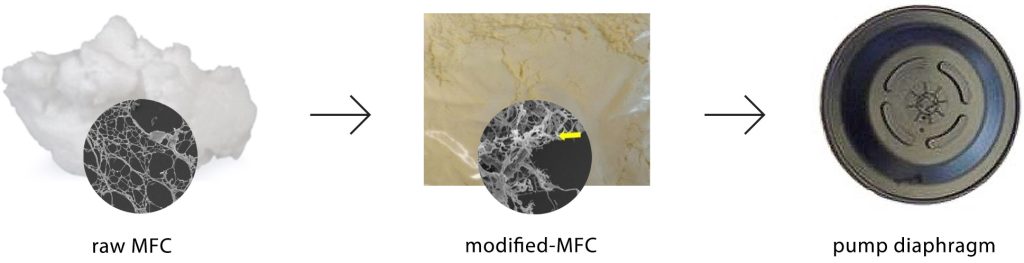 First trials envisioned the substitution of aramid fibers with modified MFCs. The results show good compatibility between the MFC-filler and the elastomer matrix with strong reinforcing effect, even superior to those reached with conventional petroleum-based fibers. Based on these promising research results, Datwyler has patented the process and will work on its implementation for industrial mass production in the next phase. The development of these novel cellulose-based fillers will result in an important step towards increasing sustainability in elastomer products such as pump diaphragms.
